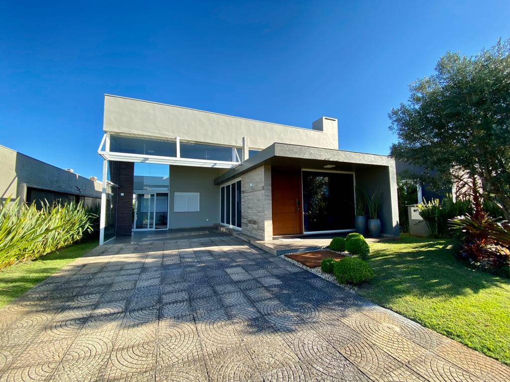 Casa no Condomínio Enseada. Belíssima casa com arquitetura moderna com 4 suítes, lavabo, living integrado em 3 ambientes com lareira, cozinha americana com churrasqueira, ampla área de serviço, espaço gourmet, piscina de concreto e abrigo para carros. Casa com alto padrão construtivo, esquadrias em PVC, piso porcelanato, porcelanas e metais classe “AAA”, deck, água quente e jardim com irrigação automática e iluminação. Xangri-lá/Casa em condomínio/Condomínio Enseada.