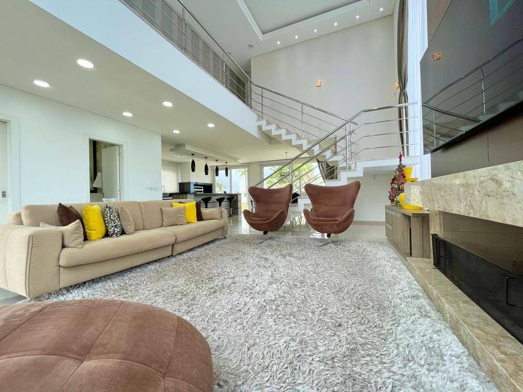 Sobrado no Condomínio Riviera. Belíssimo sobrado com arquitetura moderna com 4 suítes, lavabo, living integrado em 3 ambientes com lareira e pé direito alto, cozinha americana com churrasqueira, ampla área de serviço e abrigo para 02 carros. Sobrado com alto padrão construtivo, esquadrias em PVC, piso porcelanato, porcelanas e metais classe “AAA”, deck, água quente e jardim com irrigação automática e iluminação. Xangri-lá/Casa em condomínio/Condomínio Riviera